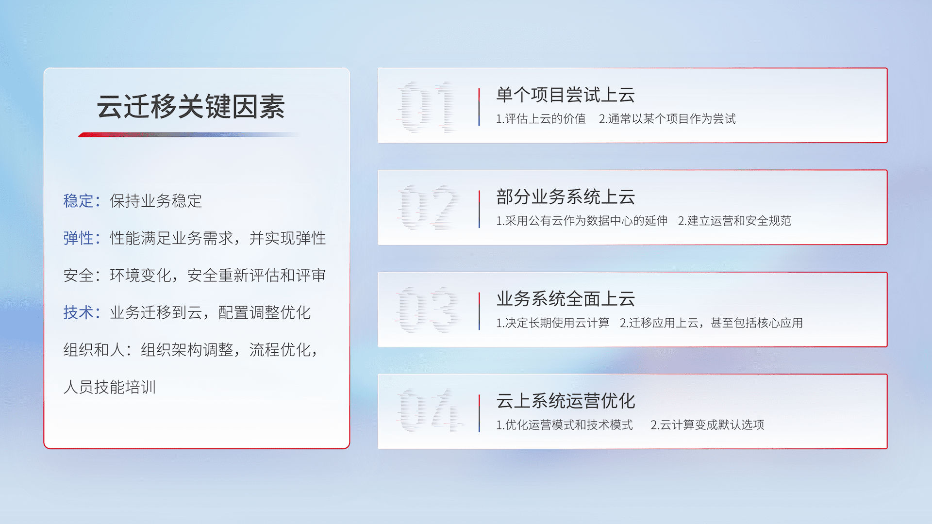 结合实际业务,,从规划设计、、、、云平台选型、、、、云原生改造、、数据迁移、、集成交付,,迁移全过程为客户识别最佳上云路径,,,,做好风险识别管理,,设计网络架构、、、、身份权限、、、、安全审计合规、、操作审计、、日志审计、、、、监控告警策略、、、多站点容灾设计等,,,对云上基础设施进行整体规划,,,提升IT治理水平,,,,以满足弹性、、高可用、、、、高性能的需求。。