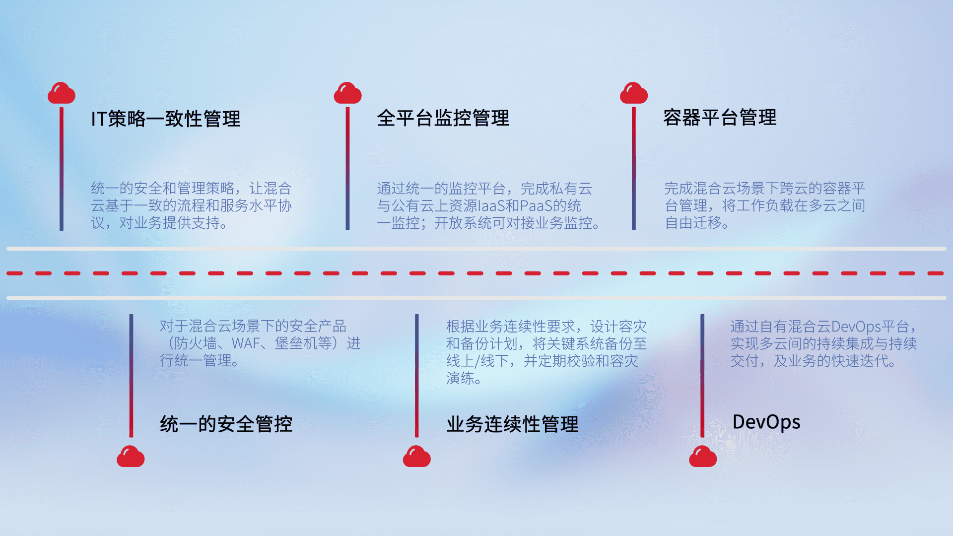 通过多云纳管,,以统一的资源数据模型把客户的云资源进行抽象和封装,,,,进而实现对多云资源的统一操作,,保障云资源管理的可靠性、、、稳定性与可用性。。。量身定制化运维内容,,配置、、、开发运维、、补丁管理、、、、备份、、、、监控、、、、认证和访问管理、、、审计和日常巡检等,,,保障在用云过程中的可靠度,,,,稳定度以及高可用率。。